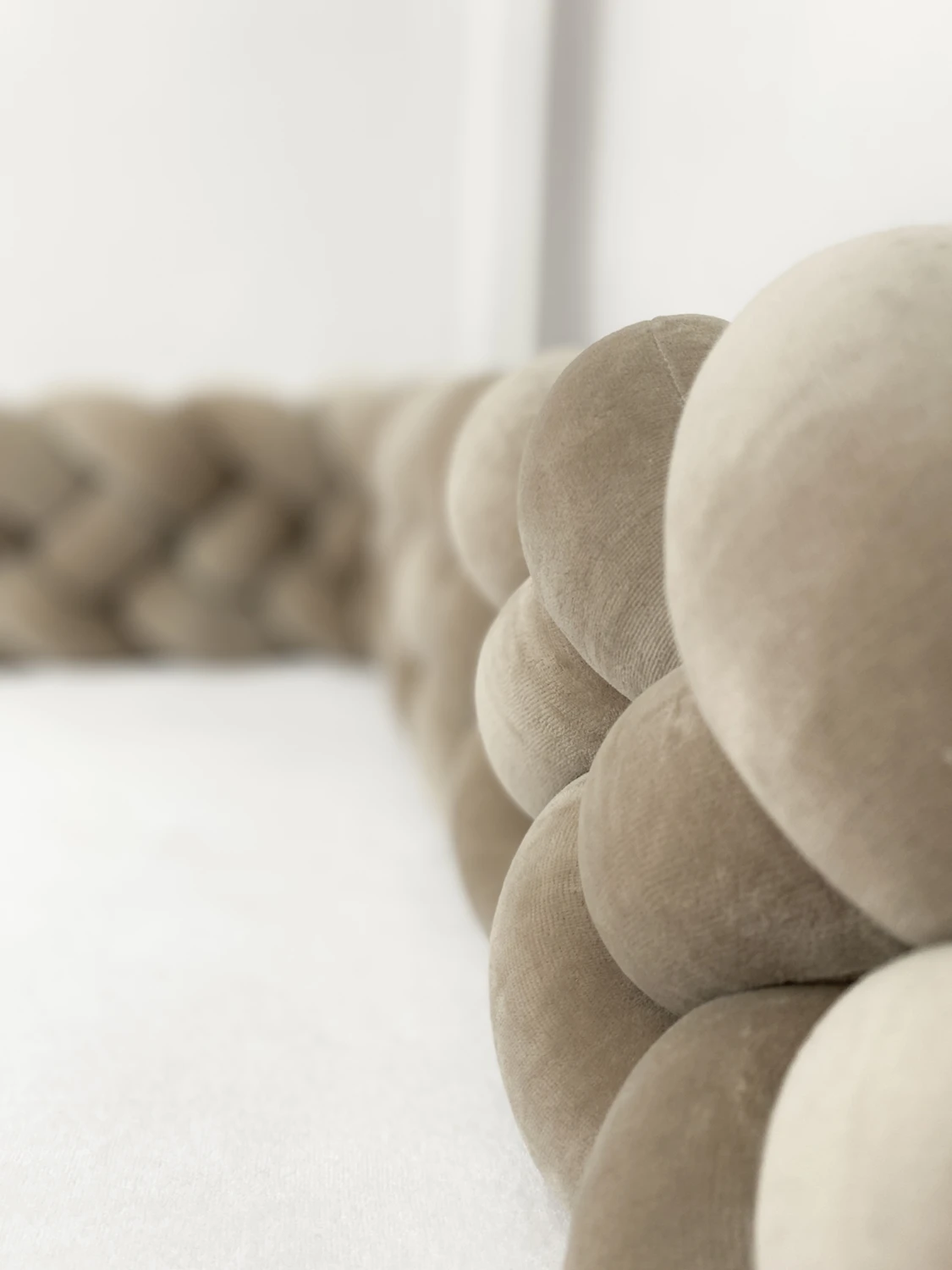 Dessutom skickar vi med en uppsättning velourband i spjälskyddets färg för att knyta fast det i sängen.